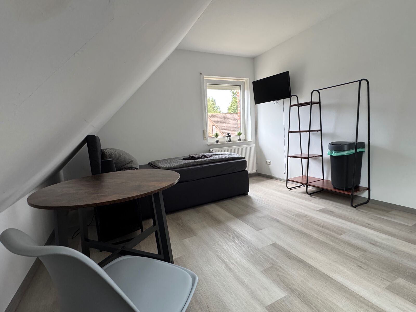 Einzelzimmer mit Esstisch, Kühlschrank und Boxspringbett.