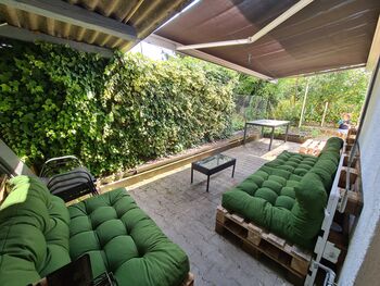 Große Terrasse mit Markise und Sitzlounge – ideal für entspannte Stunden oder ein gemütliches Grillfest.