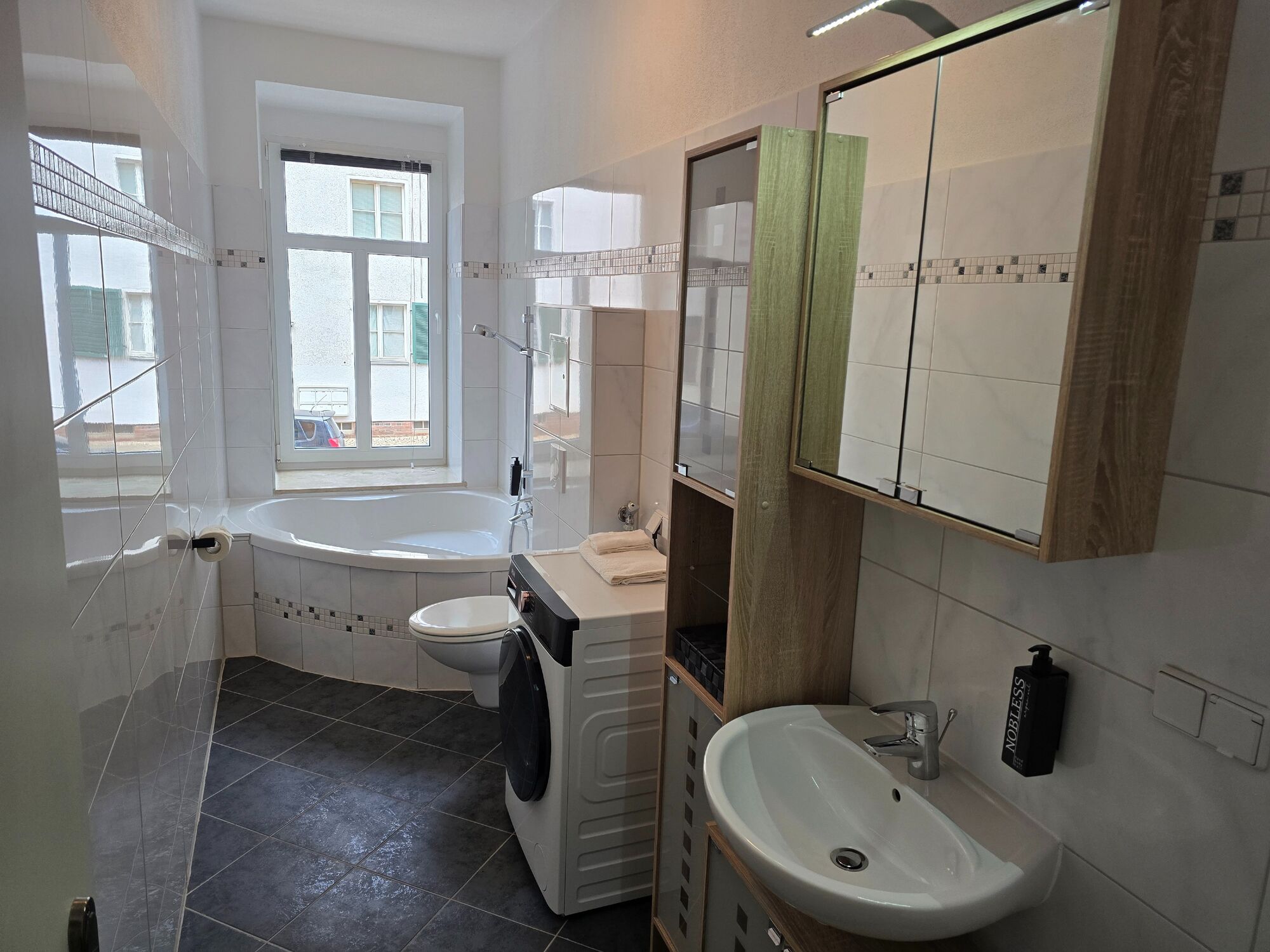 Eine gute Verkehrsanbindung und private Parkplätze auf einem umzäunten Privatgrundstück bieten höchstmögliche Privatsphäre und Sicherheit. Die Sachsenallee ist nur 4 Gehminuten vom Haus entfernt. Öffentliche Verkehrsmittel sind ebenfalls fußläufig erreichbar.