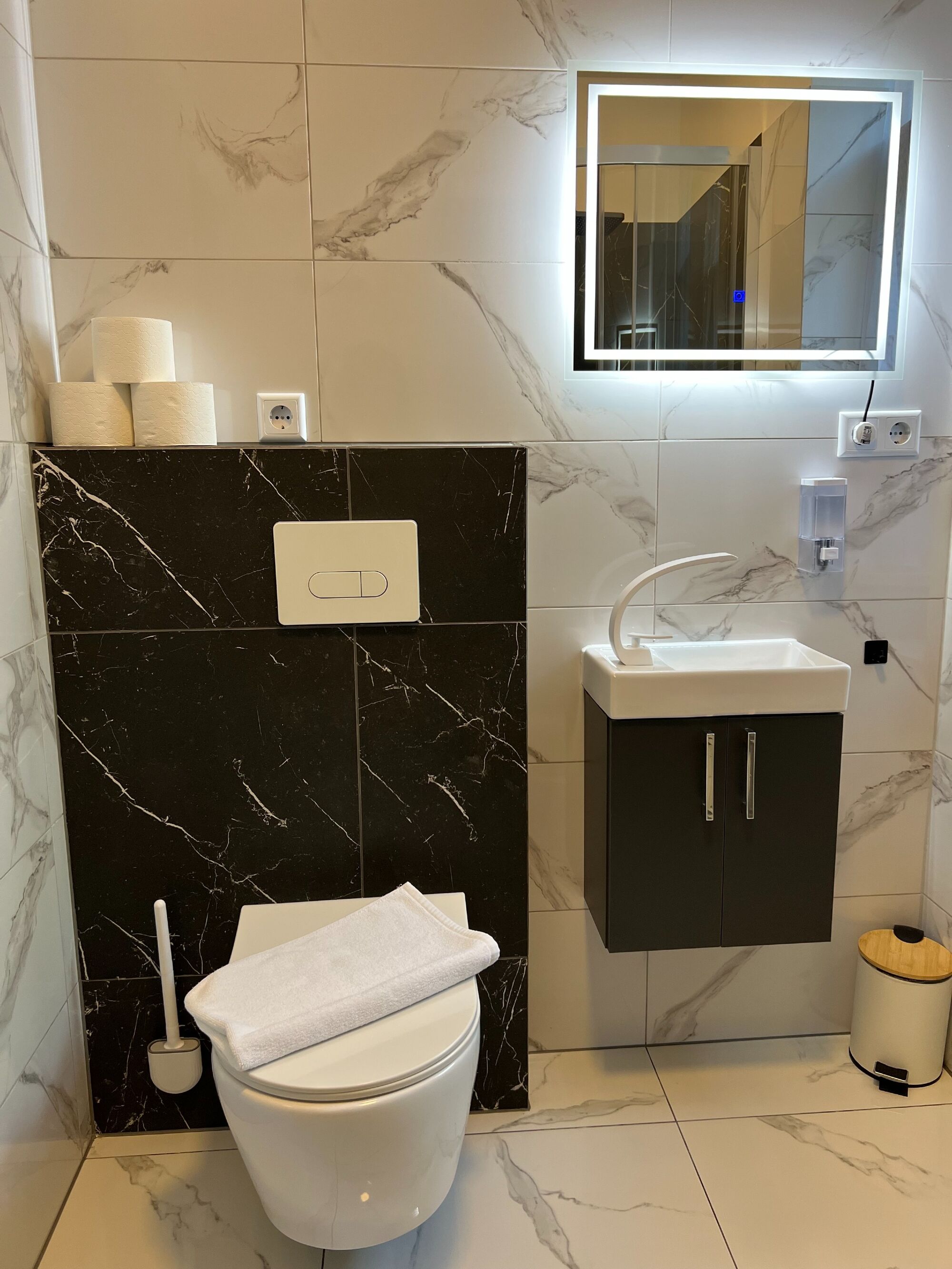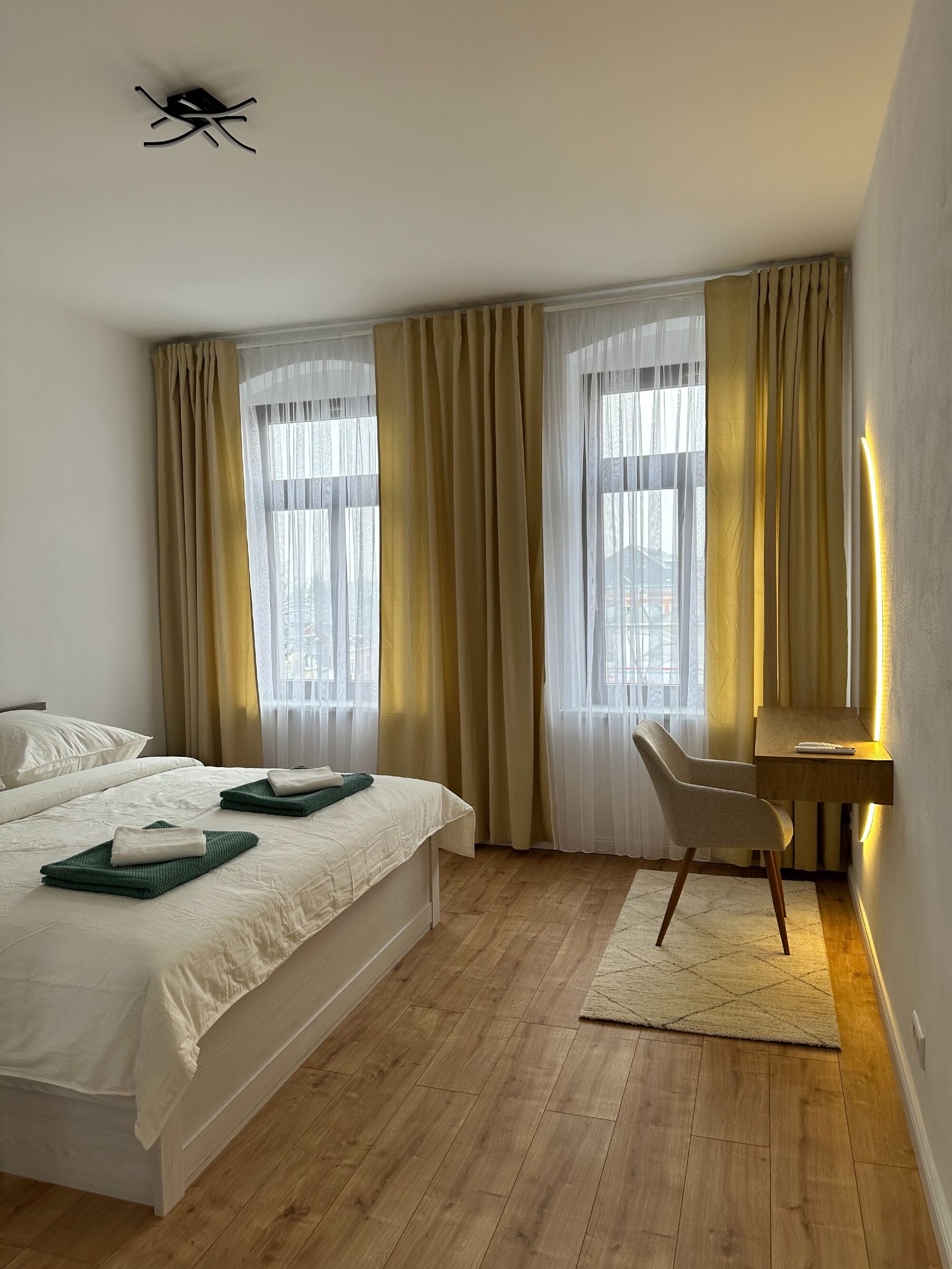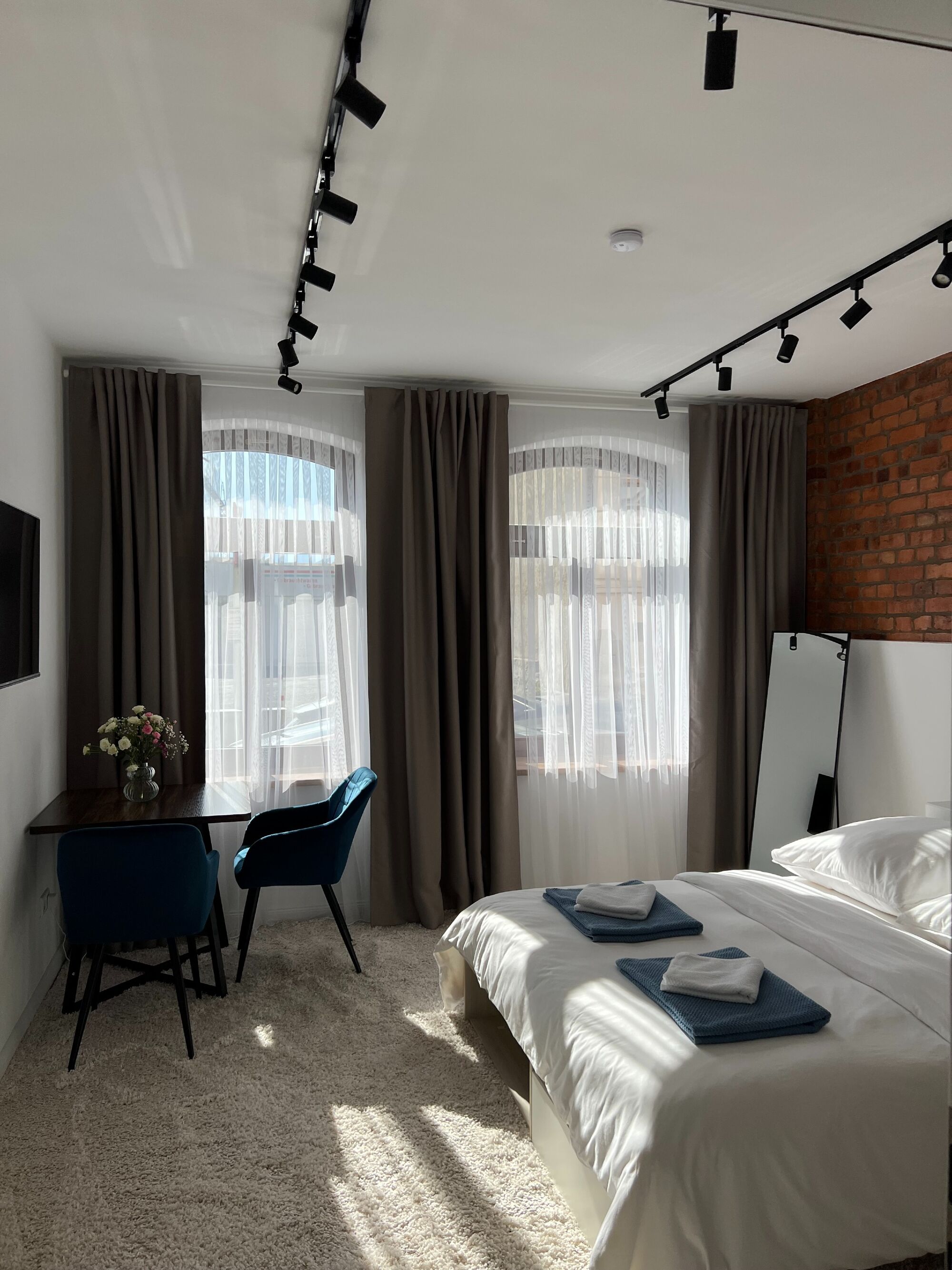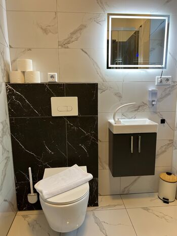Die großzügige Einzimmerwohnung verfügt über eine moderne Küche mit vollständigem Geschirr, Kühlschrank, Backofen, Herd, Mikrowelle, Kaffeemaschine und Wasserkocher. Für maximalen Komfort sorgen: Fußbodenheizung in allen Räumen Modernes Badezimmer mit hochwertigen Fliesen und Dusche Großes Doppelbett mit hochwertiger orthopädischer Matratze Großer Smart-TV Gesellschaftsspiele wie Schach und weitere Brettspiele Kostenfreies WLAN und Kabelfernsehen Individuelle Temperaturregler in jedem Raum