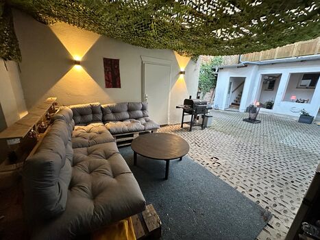 Apartment mit 2 Zimmern und 4 Einzelnetten und eine Couch als Doppelbett, voll ausgestattete Küche mit Herd, Backofen, Mikrowelle, Kühlschrank, Gefrierschrank, Dusche, Grill und Chillarea im Innenhof