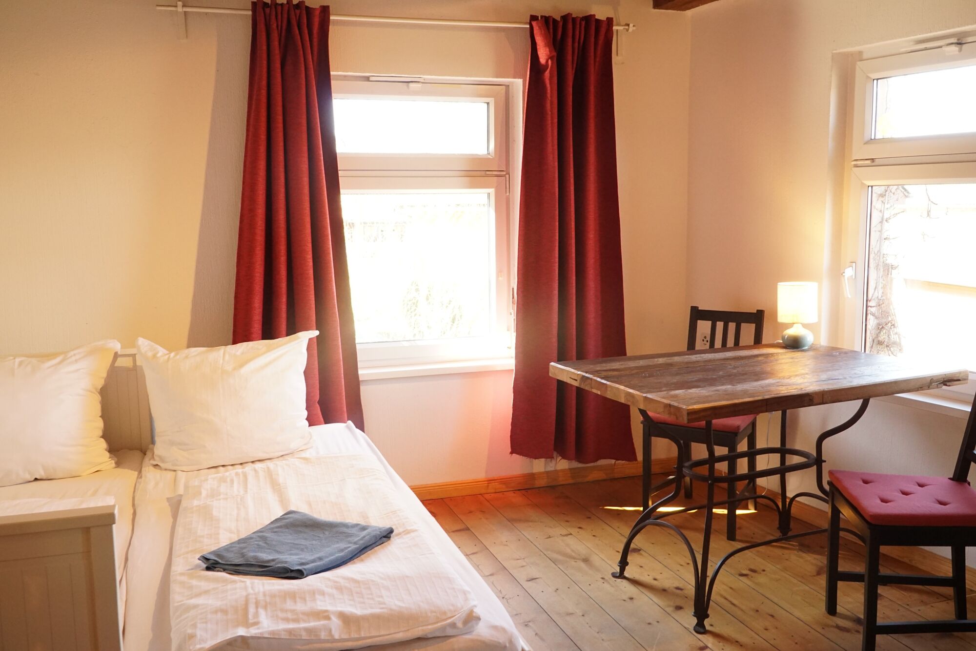 Bis zu 8 Personen möglich: 2 Schlafzimmer mit je 2 Einzelbetten (insgesamt 4 Gäste) und 4 Einzelzimmer. Für Ihre individuelle Gästezahl kontaktieren Sie uns bitte telefonisch oder per E-Mail – wir erstellen Ihnen ein passendes Angebot. Bei längeren Aufenthalten nennen Sie dies bitte in der Anfrage, damit der Preis angepasst werden kann.