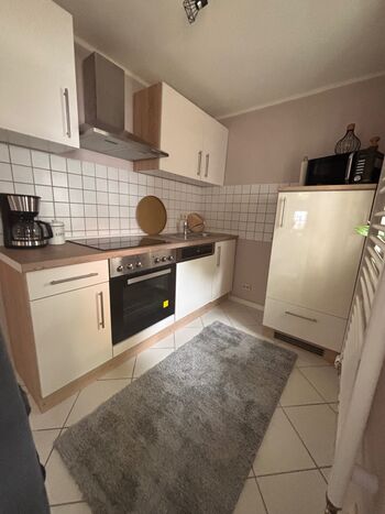 Küche mit Herd, Backofen, Geschirrspüler, Mikrowelle