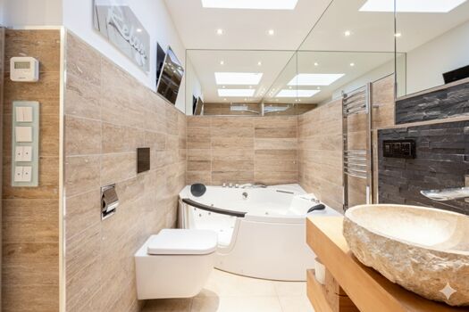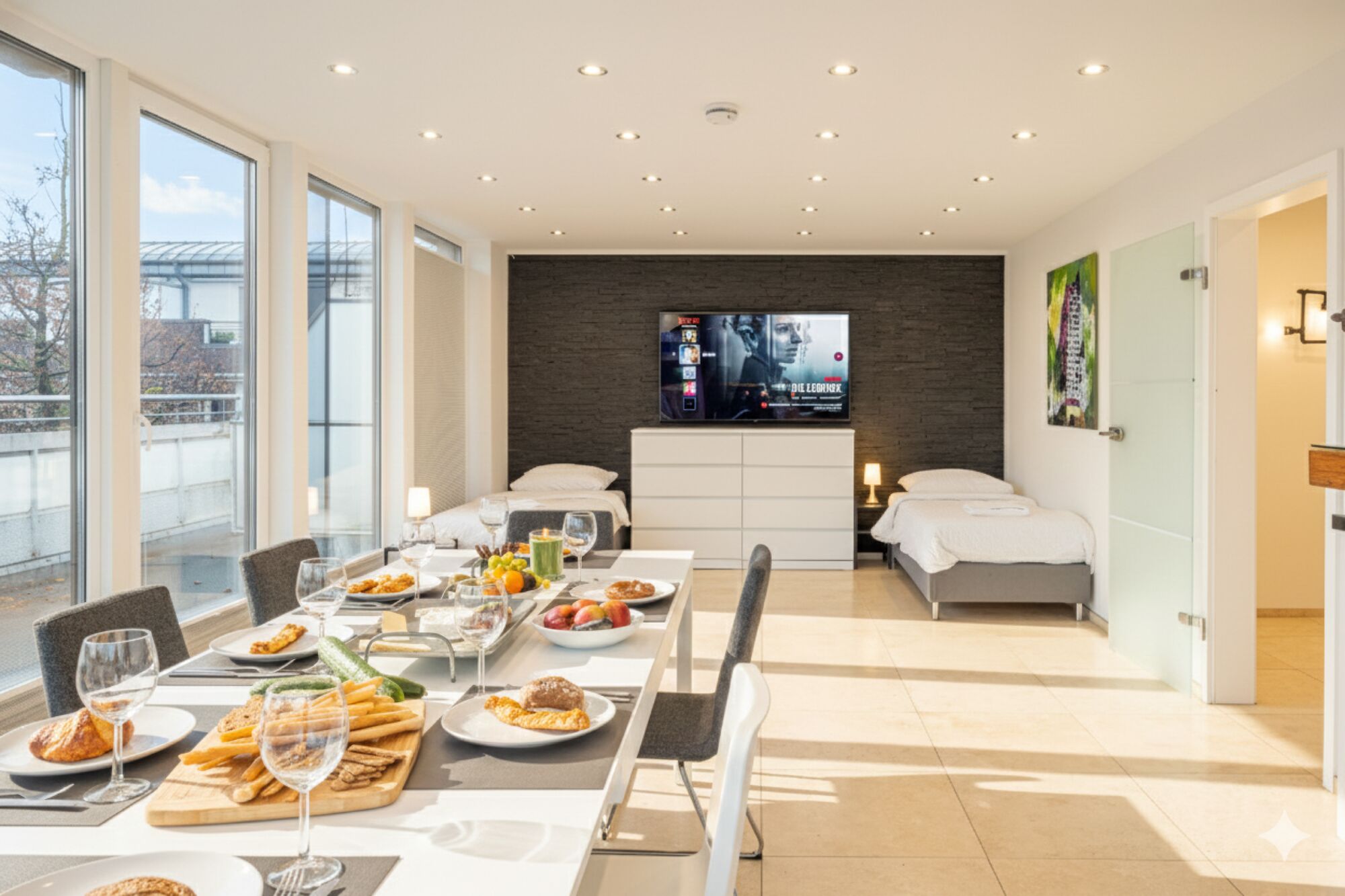Modernes Apartment mit zwei Schlafzimmern (1x drei Einzelbetten und 1x zwei Einzelbetten), zwei Bädern (mit WC und Dusche), Küche (voll ausgestattet) und Wohnzimmer Jeder Raum hat einen eigenen 70 Zoll Fernseher Im Wohnzimmer befinden sich zwei Einzelbetten Kostenlos Parkplätze zwischen 18h und 8h um das Apartment herum