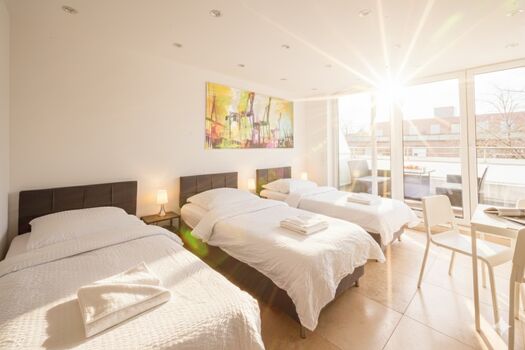 Modernes Apartment mit drei Schlafzimmern (2x drei Einzelbetten und 1x zwei Einzelbetten), Wohnzimmer mit Schlafcouch, eine Bad mit Dusche (ohne WC) und ein WC, Küche (voll ausgestattet) 40 Zoll Fernseher in jedem Schlafraum Kostenlos Parkplätze zwischen 18h und 8h um das Apartment herum