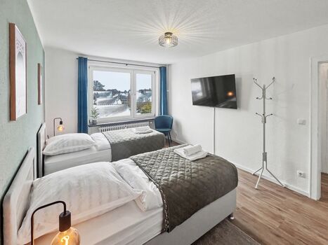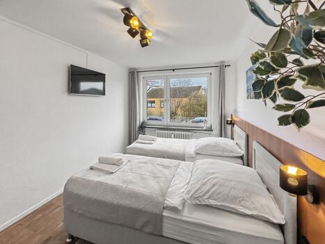 1 Wohnung mit 4 Betten I 2 Zimmer I Küche I Waschmaschine I Parkplätze Wir bieten 1 moderne und voll ausgestattete Monteurwohnung mit insgesamt 4 Betten – ideal für kleine Teams. Das Apartment verfügt über 2 Schlafzimmer, bequeme Einzelbetten und bieten ausreichend Platz für alle Übernachtenden. Die Wohnung verfügt über eine voll ausgestattete Küche mit einen großen Kühlschrank, großzügig geschnitten und ideal für die Selbstverpflegung im Team.