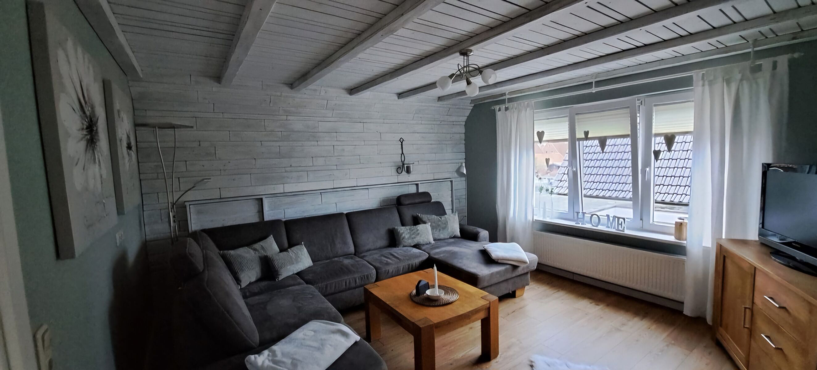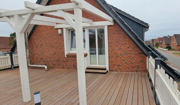 Das Apartment verfügt über ein Schlafzimmer mit einem komfortablen Doppelbett und einem Einzelbett, das eine erholsame Nachtruhe verspricht. Die Küche ist mit modernen Kochutensilien ausgestattet und bietet alles, was Sie zum Zubereiten von Mahlzeiten benötigen, einschließlich eines Kühlschranks, Mikrowelle und einer Kaffeemaschine.Von der Küche gibt es einen Zugang auf die Dachterrasse . Im angrenzenden Wohnzimmer ist ein Fernseher vorhanden und eine große Wohnlandschaft. Frische Bettwäsche und Handtücher sind im Preis inbegriffen, was Ihren Aufenthalt noch angenehmer gestaltet.