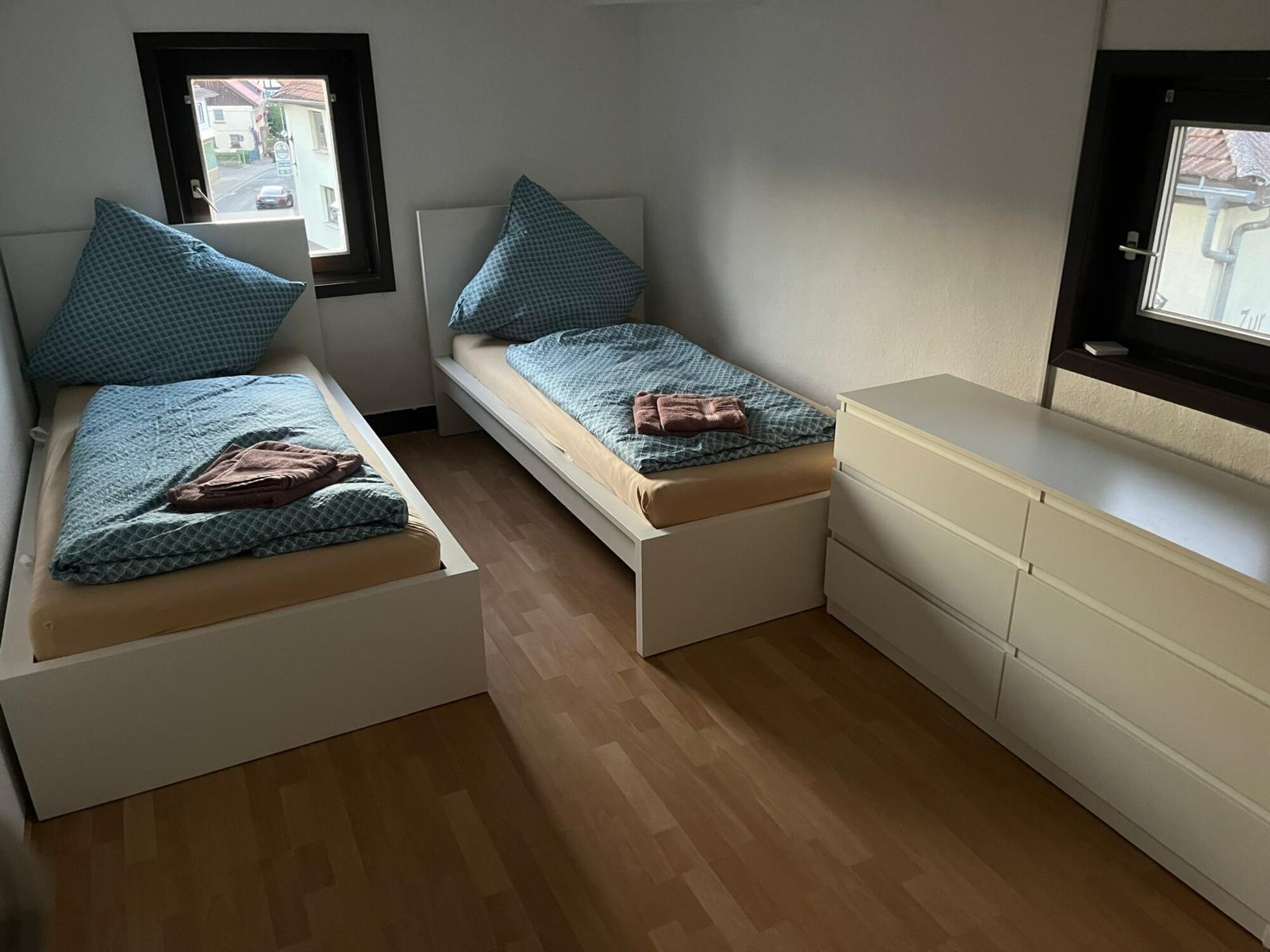 Wir bieten für Handwerker/Monteure 2 Wohnungen mit 6 modern eingerichteten Zimmern für insgesamt 13 Personen. Mehrere Stellplätze, auch für LKWs, sind direkt am Haus vorhanden. Beide Wohnungen sind mit Kühlschrank, Mikrowelle, Wasserkocher, Kaffeemaschine und Herd ausgestattet. Nur 2 km entfernt ist die Autobahn A5.