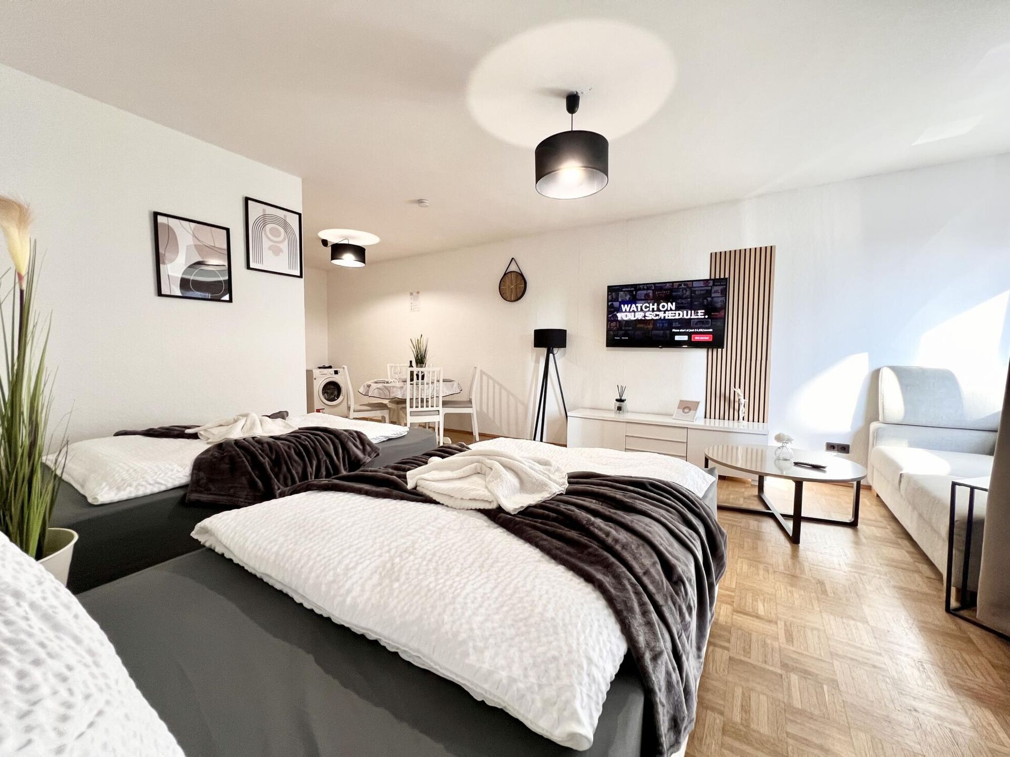 Unsere Unterkünfte liegen strategisch günstig – nur wenige Minuten zu den Autobahnen A40, A42 und A52. So erreichen Sie zentrale Einsatzorte im Ruhrgebiet wie Essen, Mülheim, Duisburg, Oberhausen und Düsseldorf schnell und ohne Umwege. Die Anfahrt ist einfach – auch mit Transportern, Sprintern oder Anhängern. Direkt vor dem Haus stehen kostenfreie Parkplätze zur Verfügung. Die Adresse ist navigationssicher – alle gängigen Navis führen zuverlässig ans Ziel. Der Check-in erfolgt jederzeit kontaktlos – ganz ohne Wartezeit, Schlüsselübergabe oder Personenkontakt. Keine Schranken, kein Stress. Ideal für Monteure und Teams mit wechselnden Einsatzorten – maximale Flexibilität bei Anfahrt, Parken und Einzug.