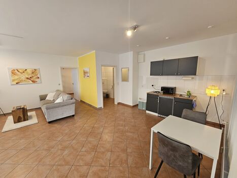 Die freundlich eingerichtete Zwei-Zimmer-Wohnung bietet alles für einen angenehmen Aufenthalt. Das Schlafzimmer verfügt über ein komfortables Doppelbett, einen Schreibtisch und einen geräumigen Kleiderschrank – ideal zum Entspannen und Wohlfühlen.