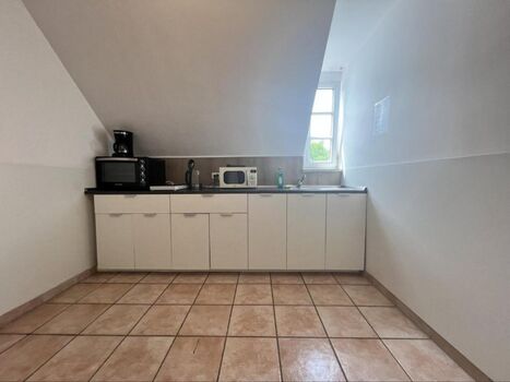 Voll ausgestattete Küche mit Mikrowelle, Toaster, Wasserkocher und Kaffeemaschine. WLAN und Smart-TV vorhanden.