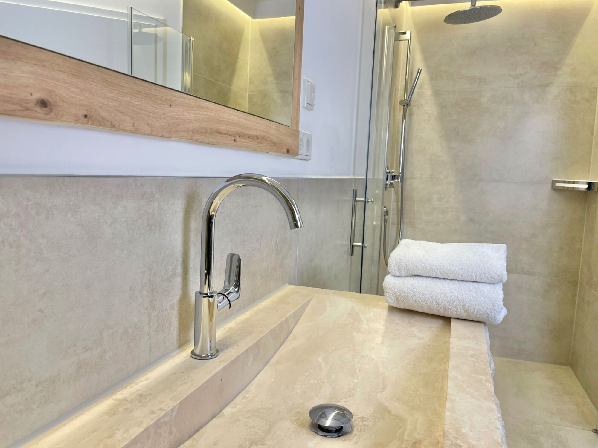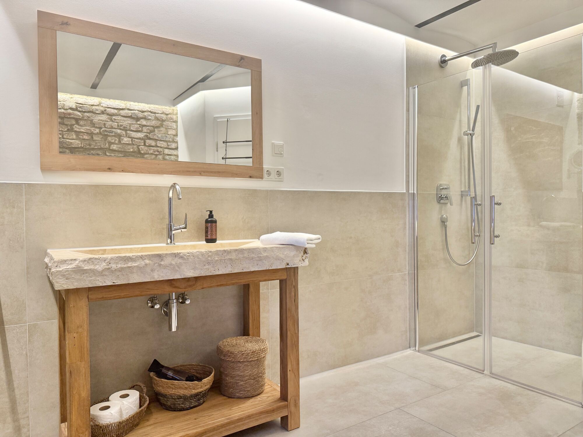 • Wohnbereich: Die Bruchsteinwände werden durch ein durchdachtes Lichtkonzept in Szene gesetzt und bilden die perfekte Kulisse für entspannte Abende.