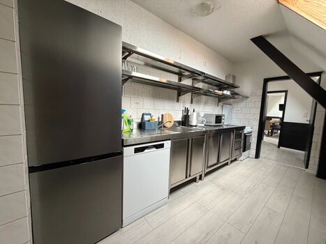 Voll ausgestattete Küche mit Herd, Backofen, Geschirrspüler & üblicher Grundausstattung