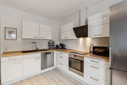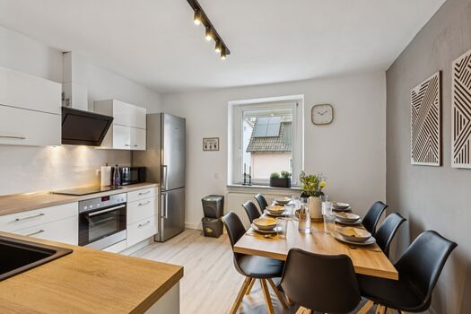 komplett ausgestatte Küche mit Geschirrspüler. Aufenthaltsraum für gemütliche Abende vorhanden, im Garten besteht die Möglichkeit sich gemütlich hinzusetzen und zu Rauchen