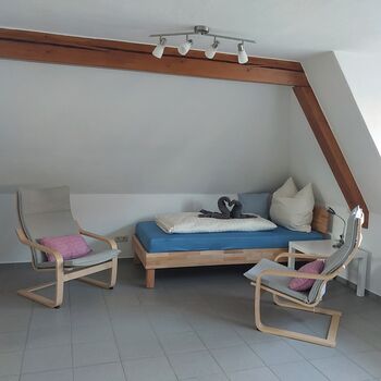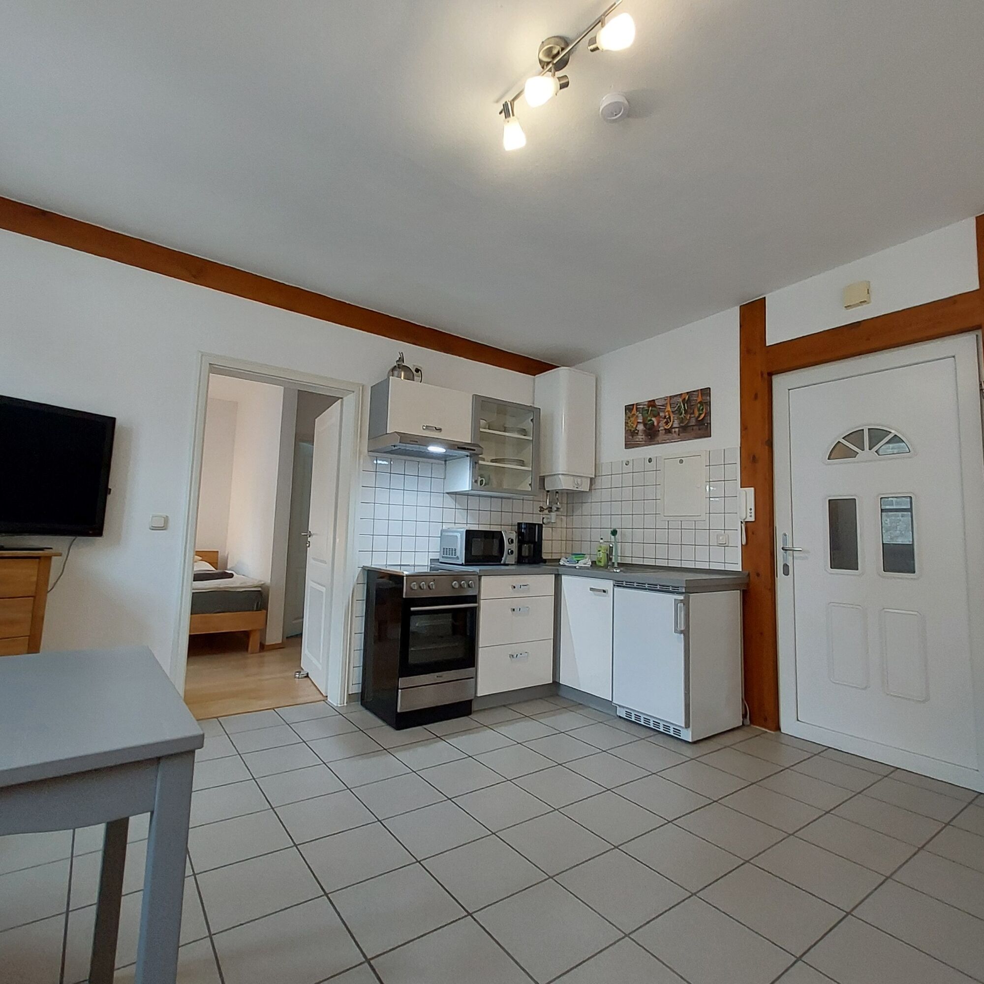 Das Zwei-Zimmerapartment bietet einen Wohn-Schlafraum und einen weiteren Schlafraum. Beide Räume bieten Sitzmöglichkeiten. zum gemütlichen Verweilen. Die Einbauküche ist mit notwendigen Elektrogeräten und einer Essgruppe ausgestattet. Das Badezimmer verfügt über Dusche und WC.